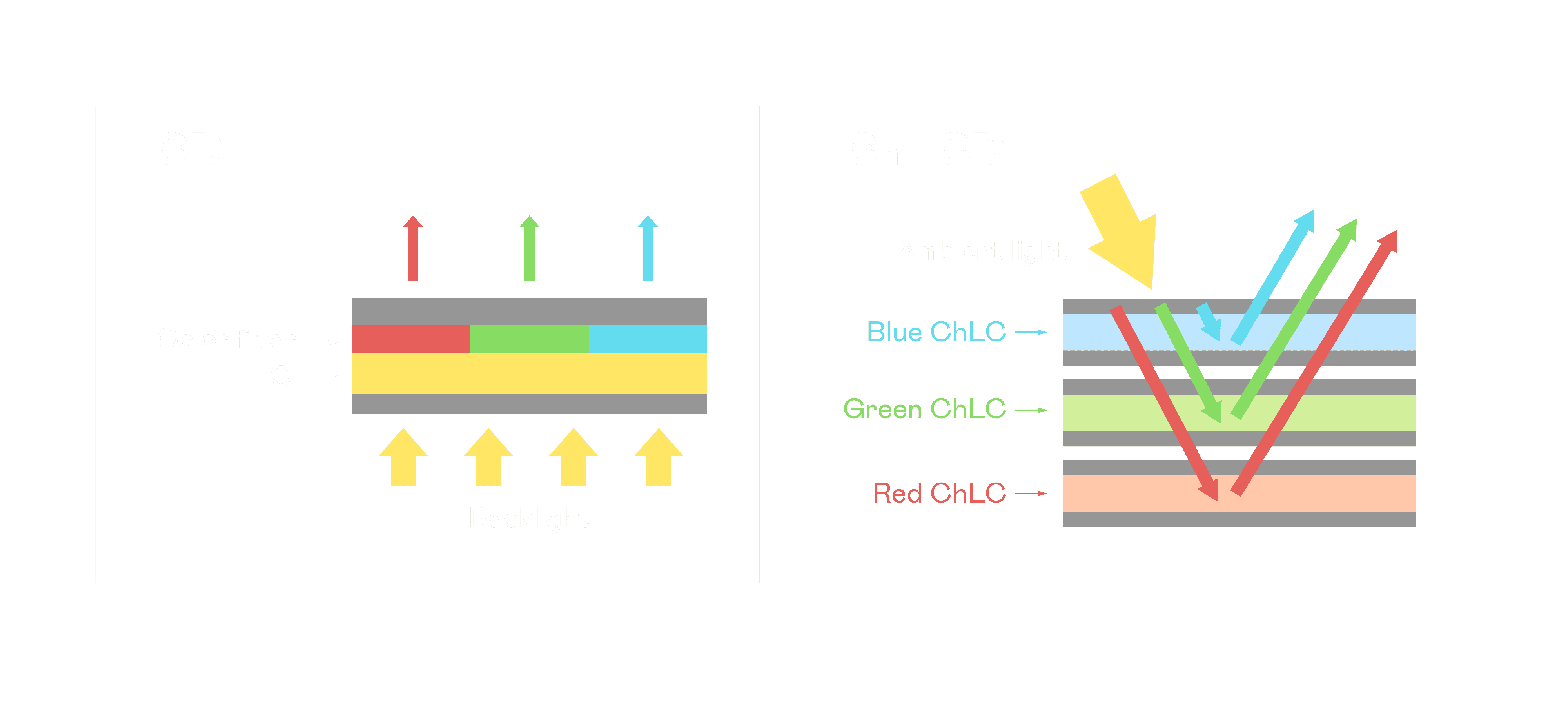 口袋牛店胆固醇液晶显示器是由红、、、绿、、蓝三层胆固醇液晶面板堆叠而成,,,并采用无彩色滤光片设计,,,减少环境光在反射过程中的损耗。。