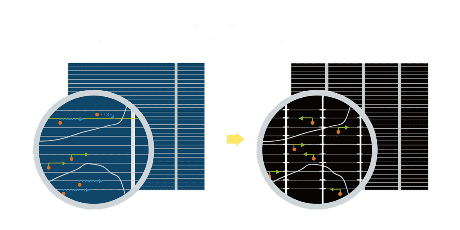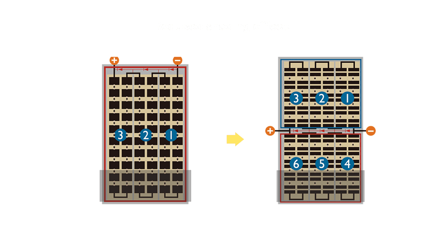 - 结合半切电池,,降低遮阴影响、、提升模组抗隐裂能力、、、并减少电阻损耗,,,进一步提升模组发电效能。。。