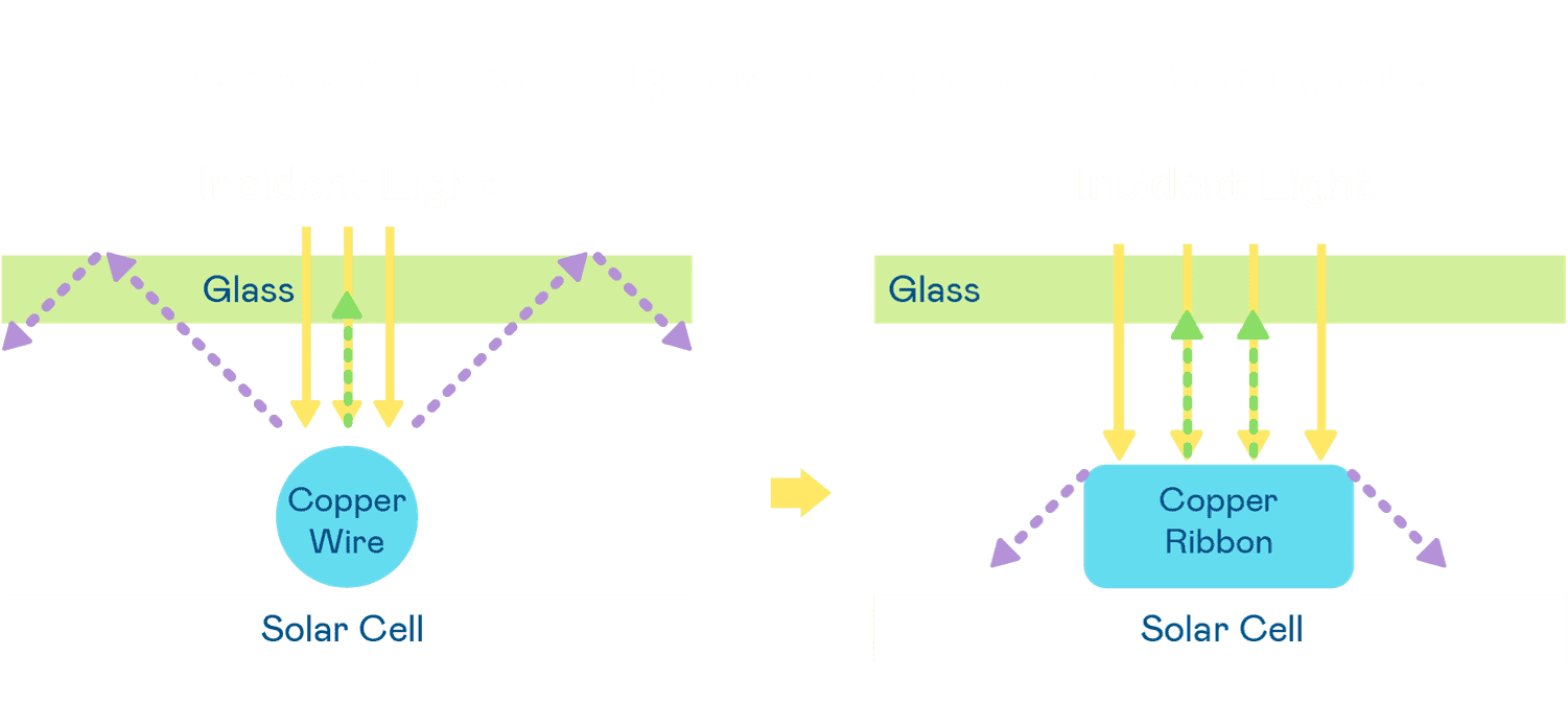 - 电池使用多条铜导线 (Copper wire) 于电池片上形成较短的电流路径,,,提高电流收集效率,,采用圆形设计的铜导线较传统扁平式的铜焊带 (Ribbon),,可增加入射至电池的光线量。。。。